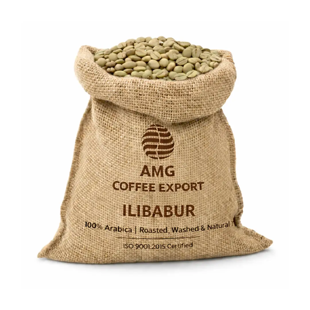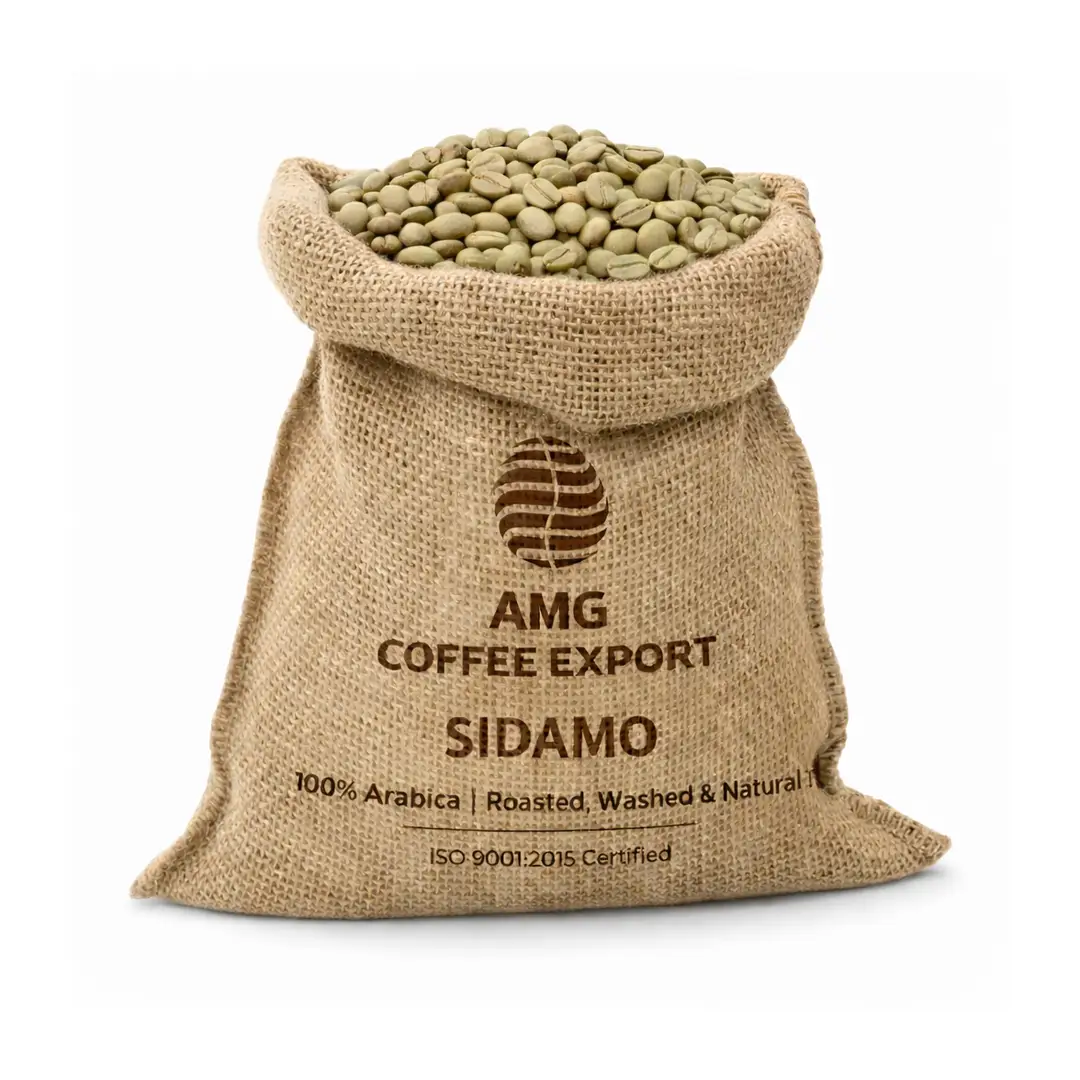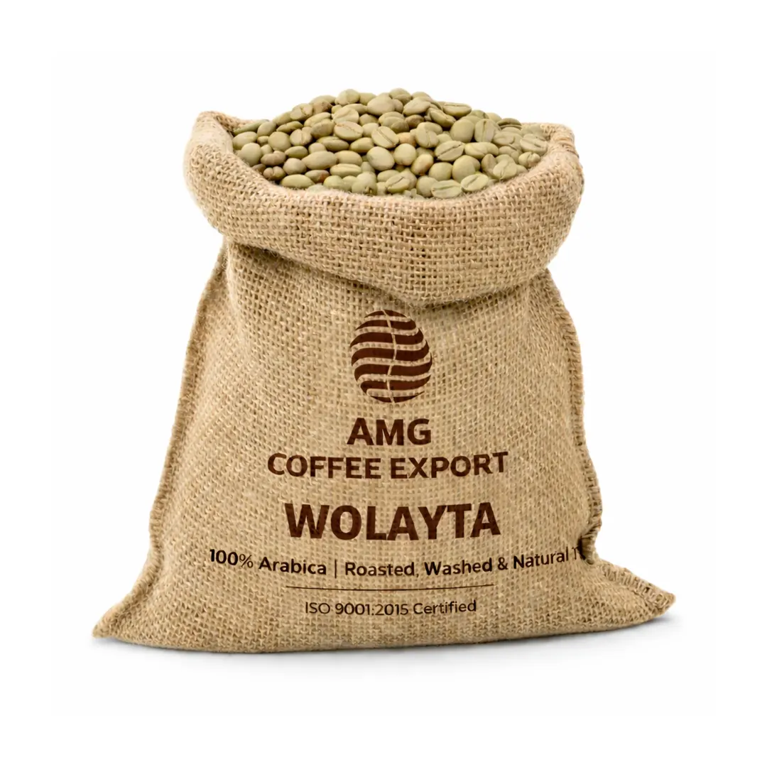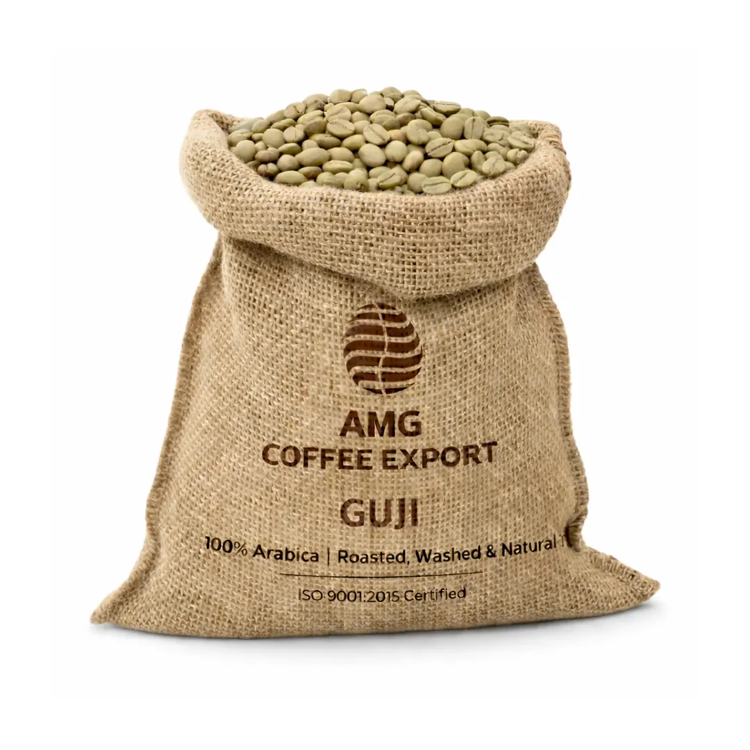 Single-origin Arabica coffee beans from Ethiopia, available in 5kg–85kg Gute bags for wholesale buyers across the UAE.
